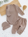 Милий та практичний комплект для новонародженого складається з боді, штанців та шапочки. Виконаний із якісної тканини інтерлок вафелька (100% бавовна), що приємна до шкіри та добре пропускає повітря. Ідеально підходить для перших днів життя малюка, щоденного носіння та як подарунок.