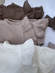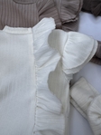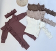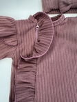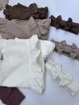 Стильний комплект для маленької принцеси 💕 включає ніжний чоловічок із рюшами та еластичну пов’язочку на голову. Виготовлений з якісної трикотажної тканини інтерлок Мустанг — ідеальний вибір для ніжної шкіри новонародженого 👶