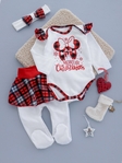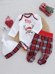 Святковий новорічний комплект для немовляти стане ідеальним образом для першої фотосесії чи святкування. До набору входить зручний чоловічок та шапочка-ковпачок у святковому стилі. Виконаний із м’якої бавовняної тканини, що не подразнює ніжну шкіру малюка.